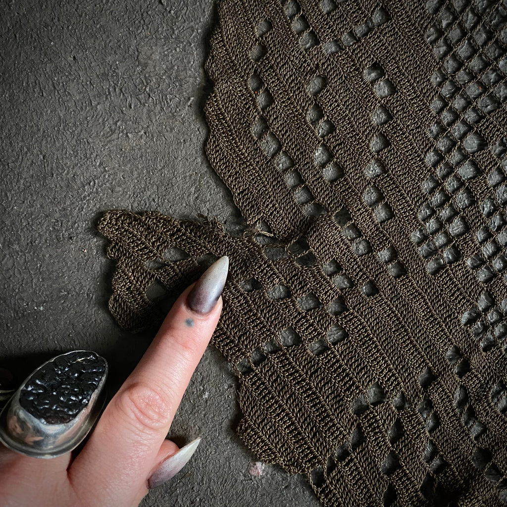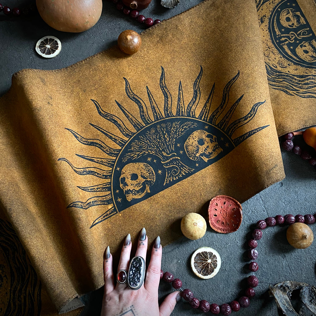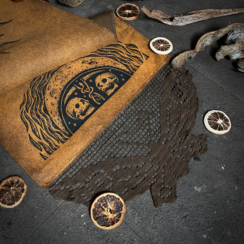 Add a touch of magical elegance to your sacred space with a One-of-a-kind Altar Cloth from Poison Apple Printshop! These signature Altar Cloths start as vintage linens, handpicked from various antique stores and estate sales. Through a handmade process of small-batch dying and screen printing, each linen is transformed from a drab, forgotten remnant into a unique and functional work of art. The antique origins of these Cloths paired with their handmade evolution ensure each Altar Cloth is one-of-a-kind and carries a nostalgic, old-world energy. Compliment your magical workings with one of these special works of art, use them for tarot spreads or resting your rare books. They also look great framed or hung on the wall like a tapestry. As signatures of Poison Apple Printshop, these unique One-of-a-kind Altar Cloths are the perfect addition to any altar, table-scape, vanity, or sacred space!