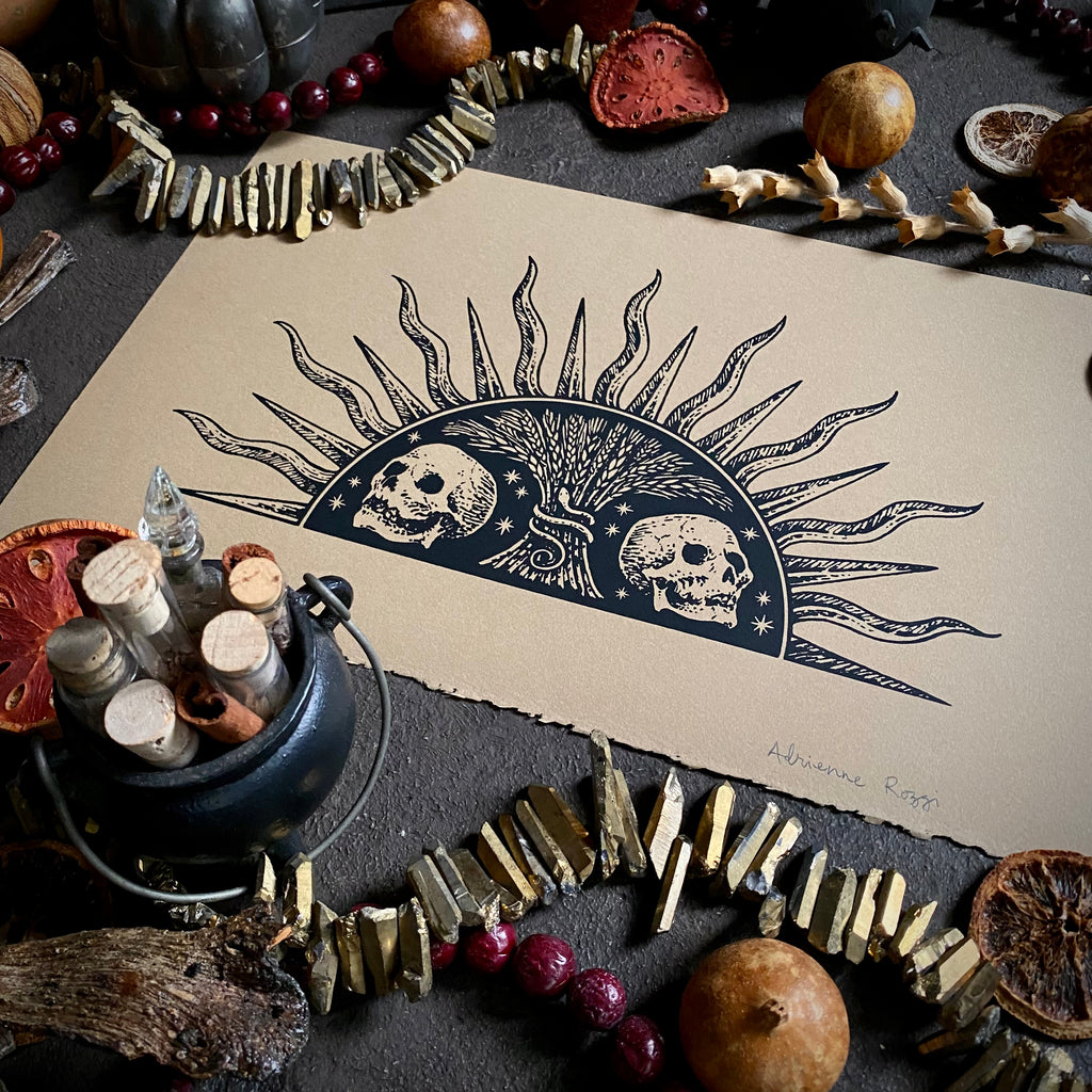 Harvest Sun is original artwork, hand drawn and screenprinted by Adrienne Rozzi.