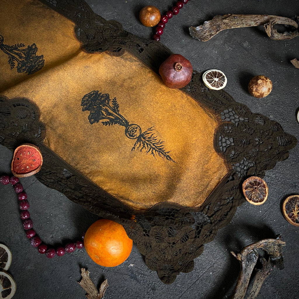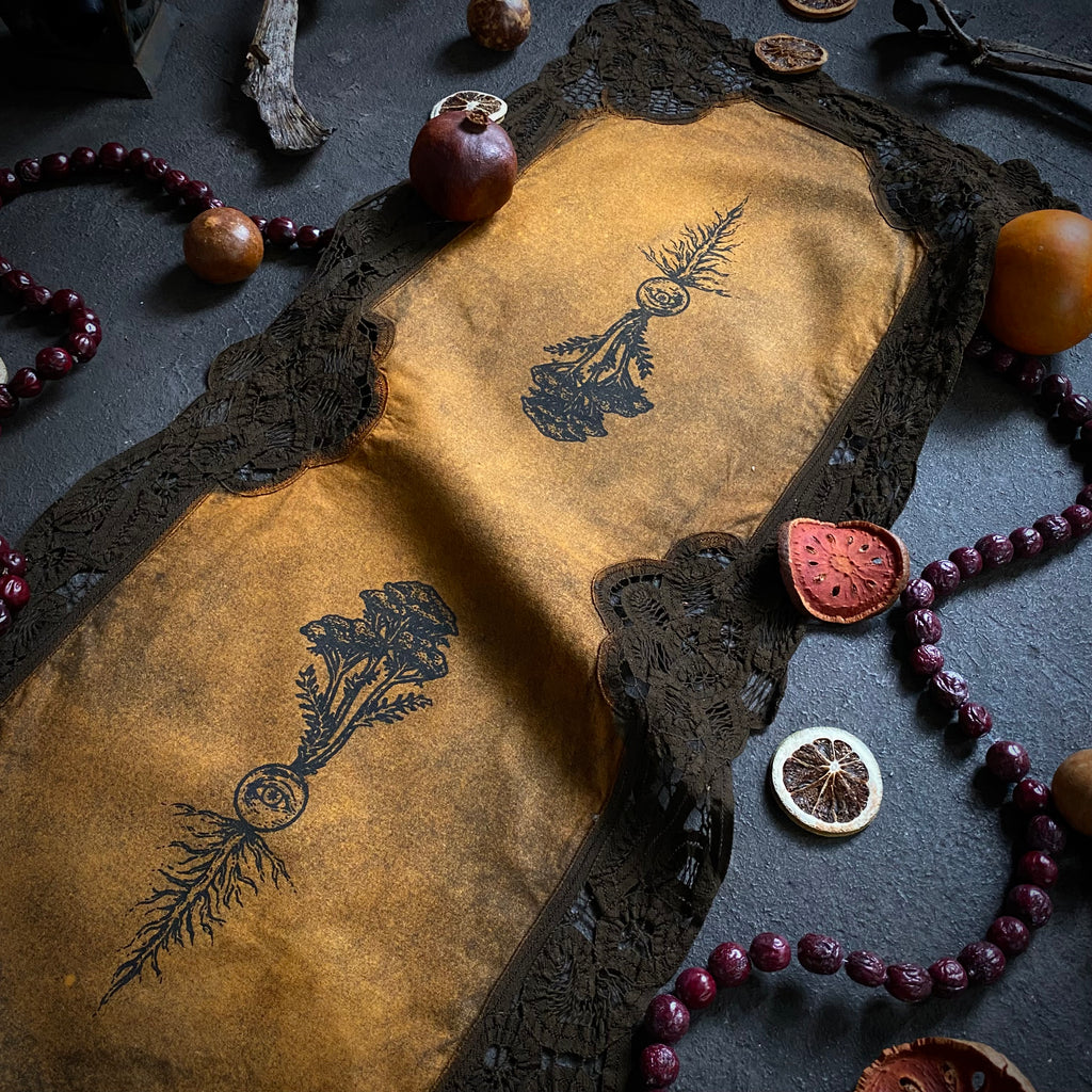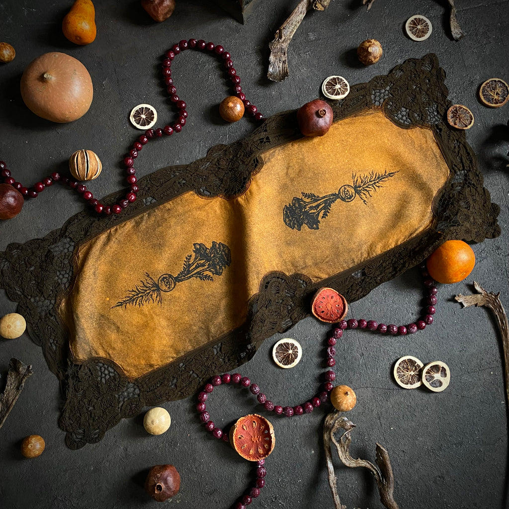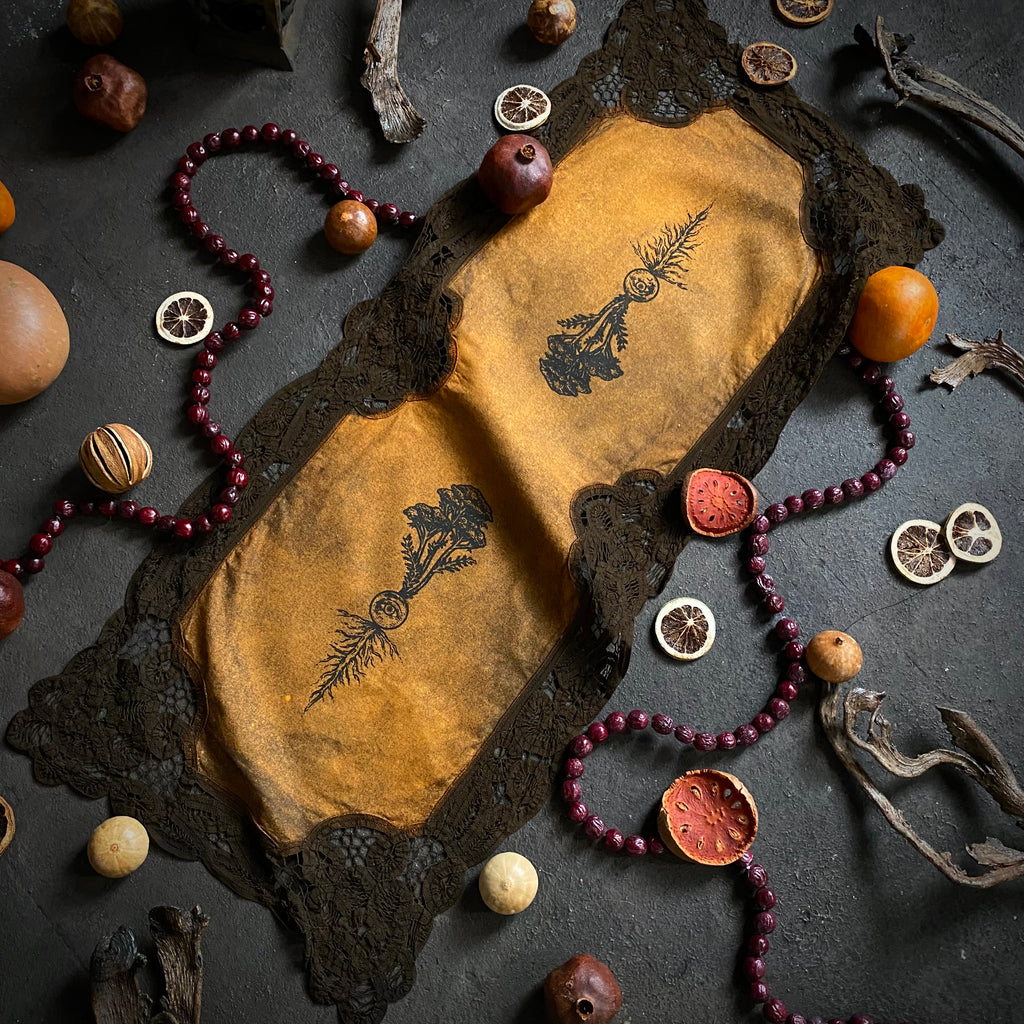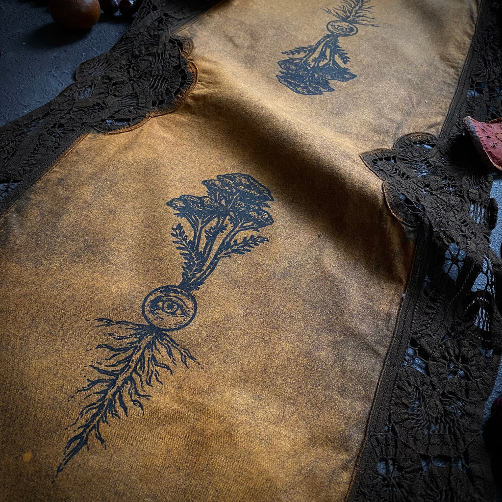 Add a touch of magical elegance to your sacred space with a One-of-a-kind Altar Cloth from Poison Apple Printshop! These signature Altar Cloths start as vintage linens, handpicked from various antique stores and estate sales. Through a handmade process of small-batch dying and screen printing, each linen is transformed from a drab, forgotten remnant into a unique and functional work of art. The antique origins of these Cloths paired with their handmade evolution ensure each Altar Cloth is one-of-a-kind and carries a nostalgic, old-world energy. Compliment your magical workings with one of these special works of art, use them for tarot spreads or resting your rare books. They also look great framed or hung on the wall like a tapestry. As signatures of Poison Apple Printshop, these unique One-of-a-kind Altar Cloths are the perfect addition to any altar, table-scape, vanity, or sacred space!