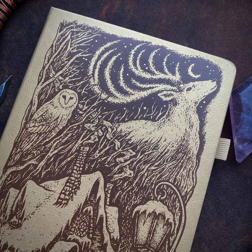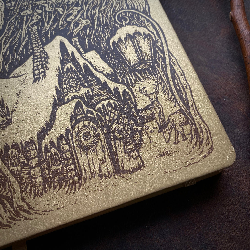 - Screen printed with brown ink on metallic champagne gold hardcover faux leather journal. The brown ink is all one color but appears ombre in the photos because of the lighting.