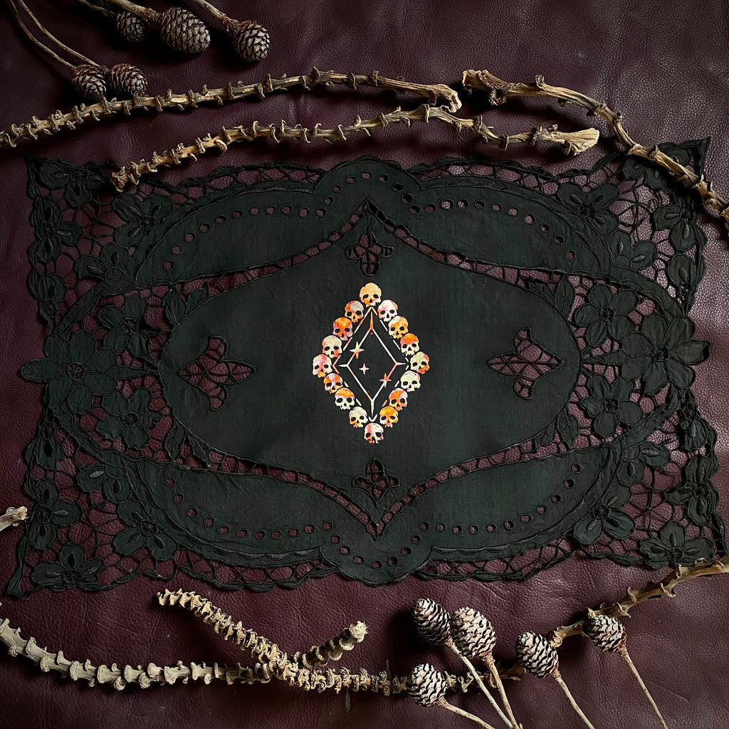 Add a touch of magical elegance to your sacred space with a One-of-a-kind Altar Cloth from Poison Apple Printshop! These signature Altar Cloths start as vintage linens, handpicked from various antique stores and estate sales. Through a handmade process of small-batch dying and screen printing, each linen is transformed from a drab, forgotten remnant into a unique and functional work of art. The antique origins of these Cloths paired with their handmade evolution ensure each Altar Cloth is one-of-a-kind and carries a nostalgic, old-world energy. Compliment your magical workings with one of these special works of art, use them for tarot spreads or resting your rare books. They also look great framed or hung on the wall like a tapestry. As signatures of Poison Apple Printshop, these unique One-of-a-kind Altar Cloths are the perfect addition to any altar, table-scape, vanity, or sacred space!