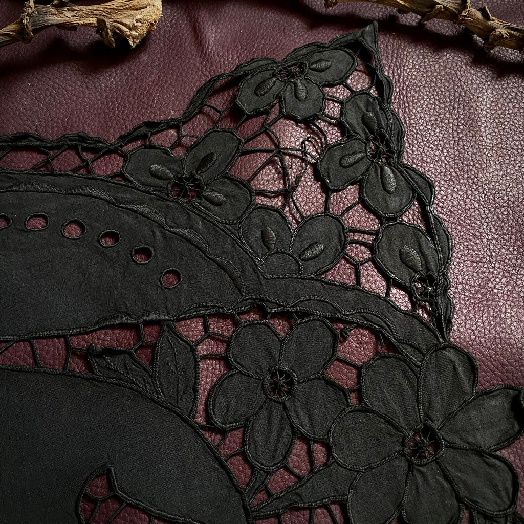 - A unique antique linen with embroidery and cutwork lace. *Please note, there are a few subtle disconnected threads among the lace. This can be seen in the photos and is taken into consideration when the price is set.