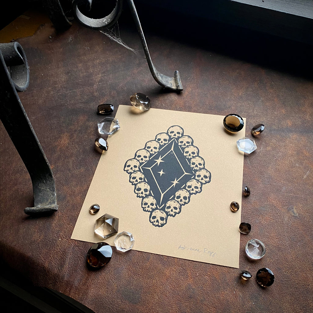 Death Diamond is original artwork, hand drawn and screenprinted by Adrienne Rozzi.