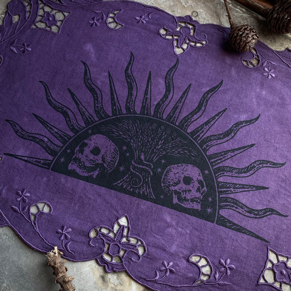 Add a touch of magical elegance to your sacred space with a One-of-a-kind Altar Cloth from Poison Apple Printshop! These signature Altar Cloths start as vintage linens, handpicked from various antique stores and estate sales. Through a handmade process of small-batch dying and screen printing, each linen is transformed from a drab, forgotten remnant into a unique and functional work of art. The antique origins of these Cloths paired with their handmade evolution ensure each Altar Cloth is one-of-a-kind and carries a nostalgic, old-world energy. Compliment your magical workings with one of these special works of art, use them for tarot spreads or resting your rare books. They also look great framed or hung on the wall like a tapestry. As signatures of Poison Apple Printshop, these unique One-of-a-kind Altar Cloths are the perfect addition to any altar, table-scape, vanity, or sacred space!
