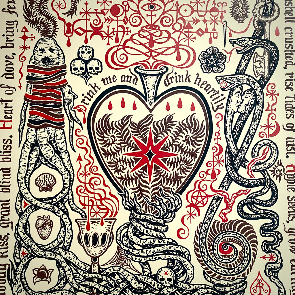 This print itself is an aphrodisiac for the eye, a simmering optic philtre, captivating in its old-world charm and seductive in its mysterious details. Starting with the essences of Pennsylvania Dutch fraktur (folk art) and Medieval illuminated manuscripts, Drink Heartily blends these two inspirations with the enchanting aesthetic and mystifying atmosphere of grimoires from throughout history. Into the mix is added a dash of flavor from Renaissance engravings. Lastly, the concentrated memory of a lost Victorian treasure infuses the potion with romance. The result is an enticing visual brew, full-bodied and enchanting down to the last drop!