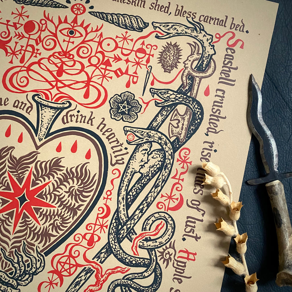 Drink Heartily is a romantic ode to the love potion— that magical, lusty elixir, as legendary as it is infamous. As if ripped from the grimoire of a medieval sorceress, this print is an imagined spell page instructing on the creation of a potent philtre. Mandrake root, apple seeds, and snakeskin sheds boil and bubble with other curious ingredients. The potion is bottled as incantations are recited over the vessel. Now, the blissful brew is destined for the lips of an unfortunate soul, spellbound to the eternal flame of the love witch!