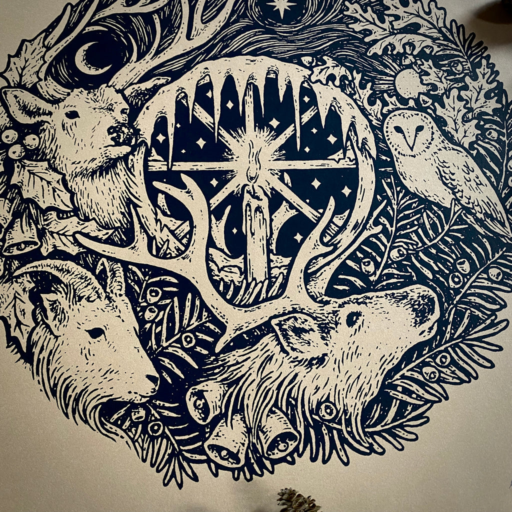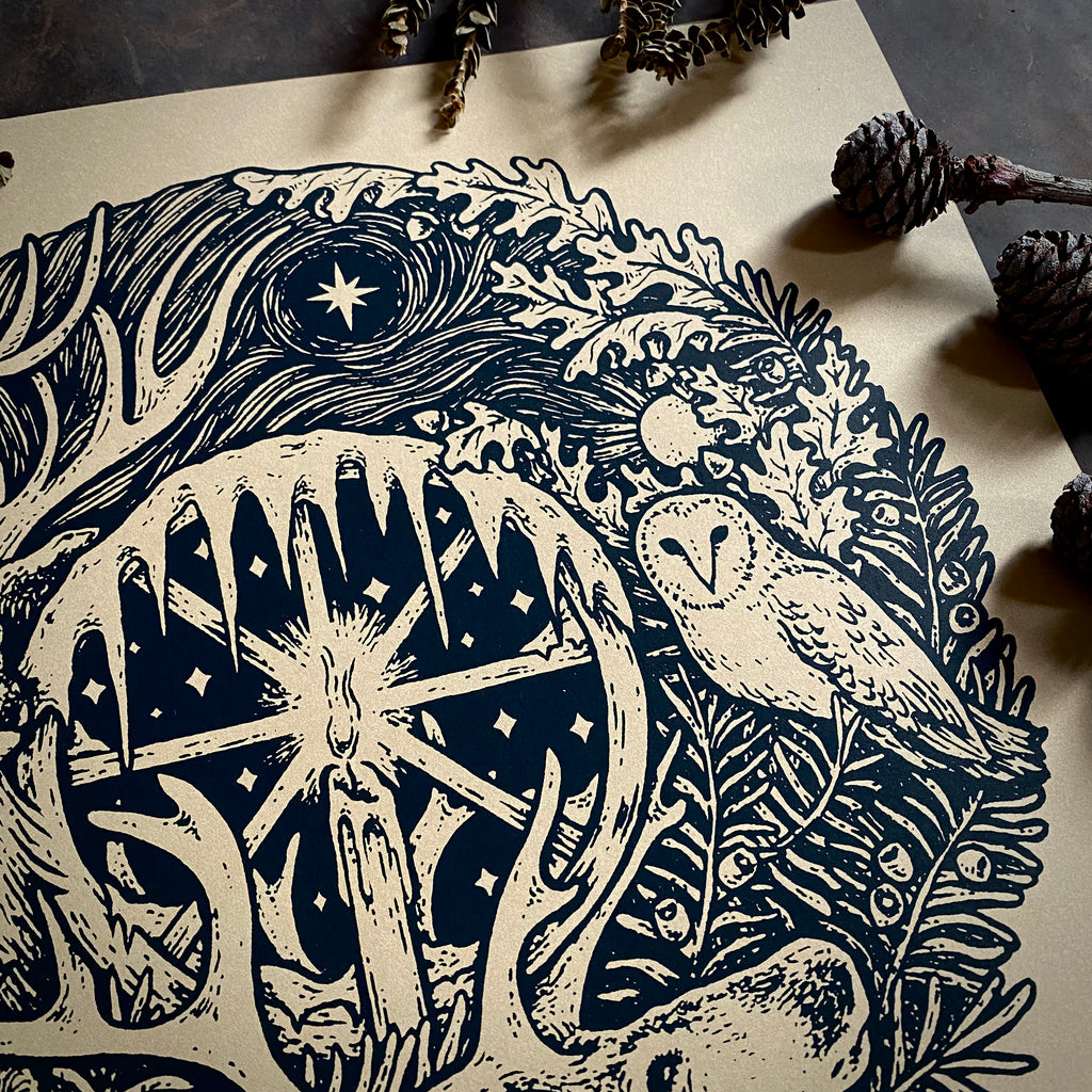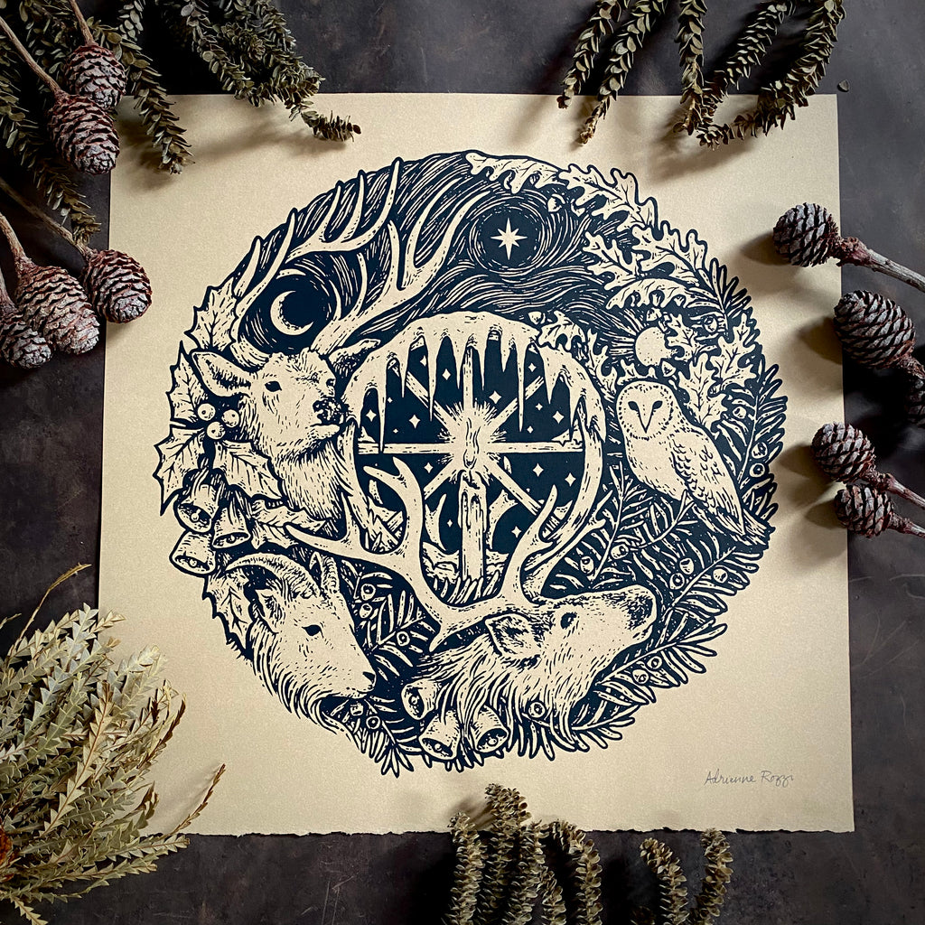 Winter's Wheel is original artwork, hand drawn and screenprinted by Adrienne Rozzi.