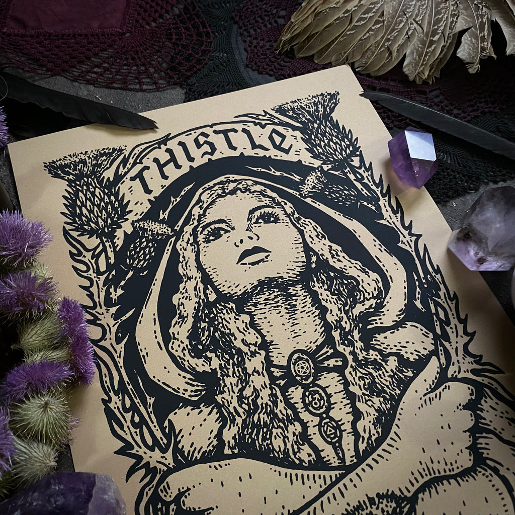 Thistle is original artwork, hand drawn and screenprinted by Adrienne Rozzi. It is the fourth print released in the printshop's Witch's Cabinet series.
